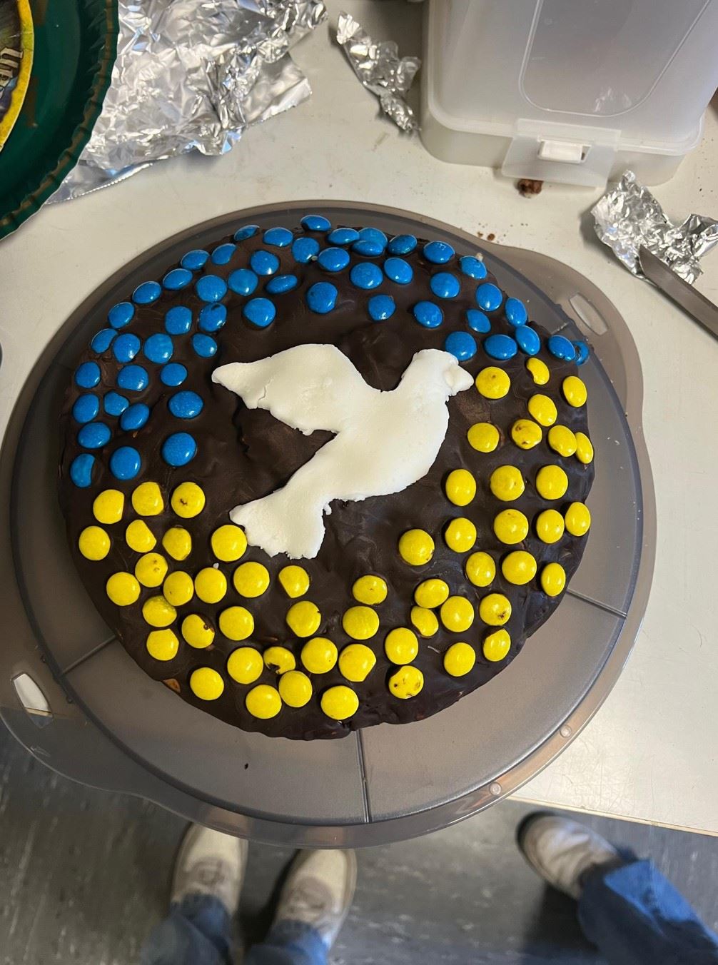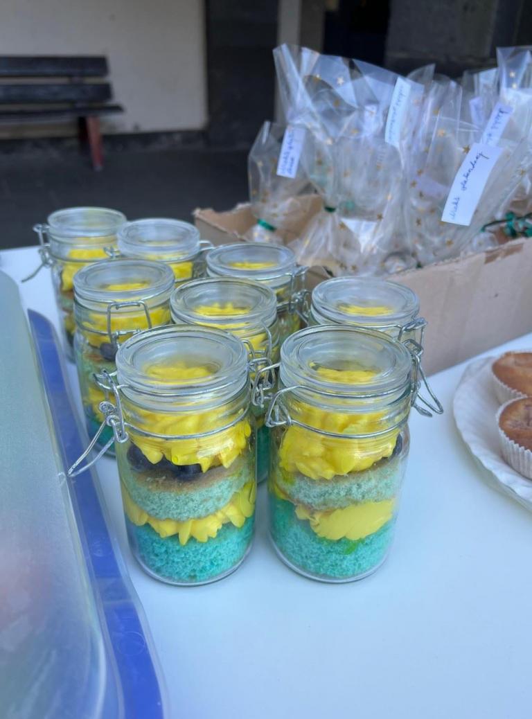 Am Donnerstag, den 10.03.2022 hat die Schülervertretung in den beiden großen Pausen den Verkauf von selbstgebackenem Kuchen und Muffins, sowie Schleifen und Armbändern in weiß, blau und gelb, organisiert.