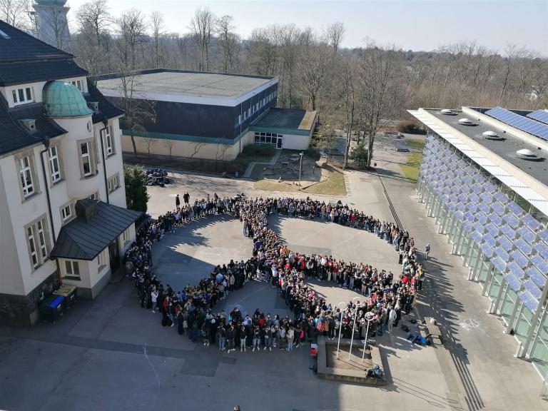 Zum Abschluss des Aktionstages bildeten die Schülerinnen und Schüler der Goetheschule gemeinsam mit dem Lehrerkollegium ein riesiges Peace-Zeichen auf dem Schulhof. Damit soll eine klare Botschaft für den Frieden und gegen den Krieg vermittelt werden.