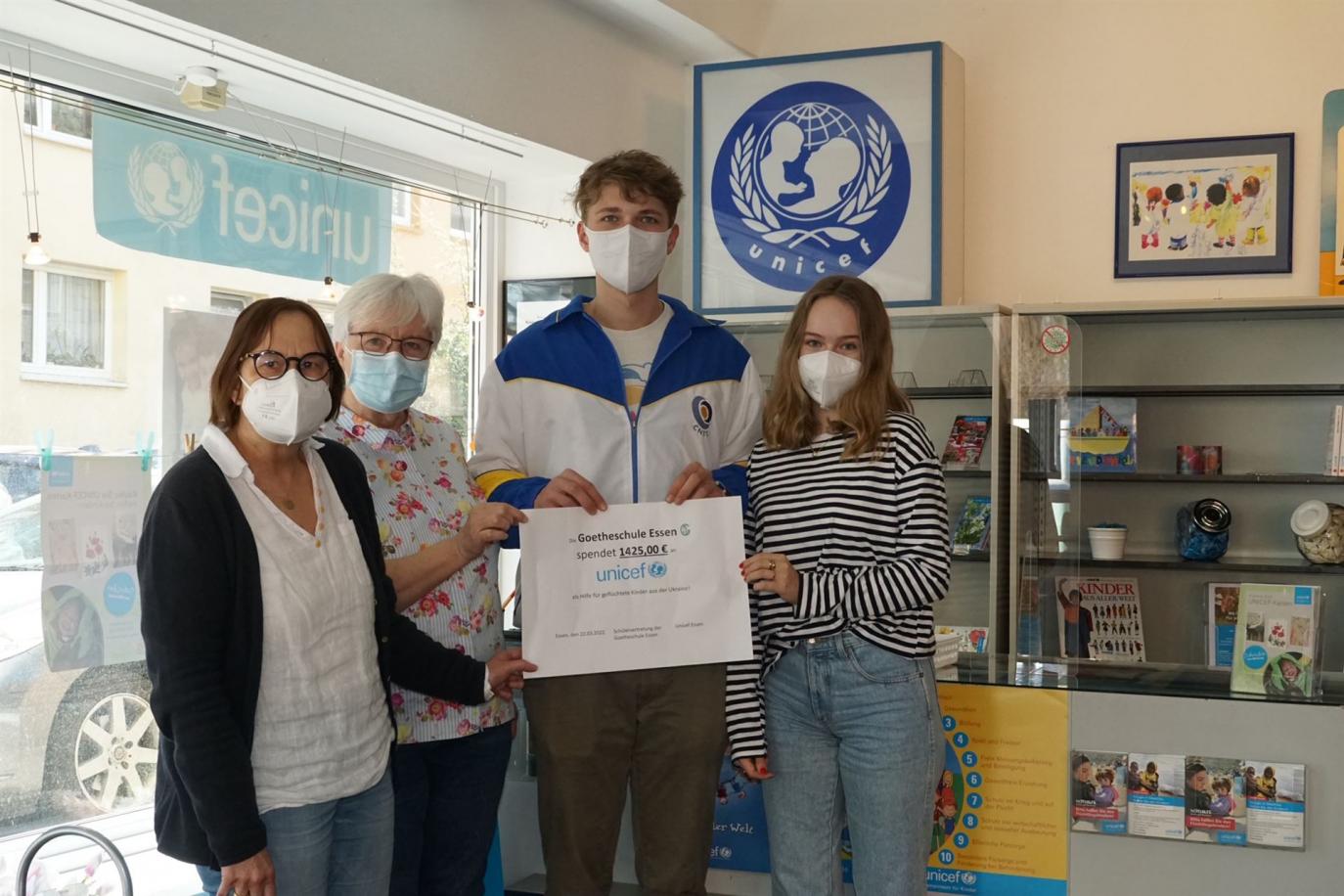 Am 22. März haben die Schülersprecher Flora Goyen und Laurenz Schmitz (beide Q2) die UNICEF Filiale in Essen besucht und die gesammelten Spenden an Herrn Ewald Goitowski übergeben. UNICEF und die SV bedanken sich bei der Schulgemeinschaft für die große Spendenbereitschaft.