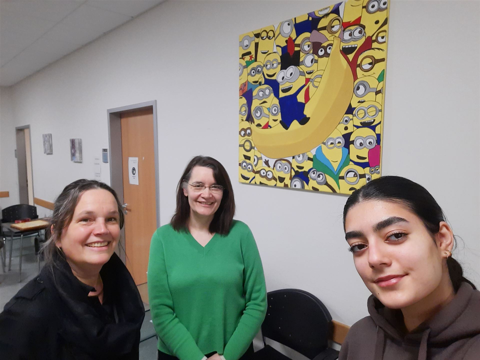 Im letzten Jahr haben wir bereits mit unserem Kunstprojekt im Gesundheitsamt Essen begonnen. Frau Dr. Elmaagacli vom Gesundheitsamt hat uns eingeladen, mit eigenen Bildideen den Flur für die Kinder neu zugestalten. Nun haben wir mit dem aktuellen Kunst-GK aus der Q2 weitere Leinwände gestaltet. Am Donnerstag, dem 23.03.2023 waren Helia (GK Kunst Q2) und Kunstlehrerin Frau Bieniek am Gesundheitsamt, um Frau Dr. Elmaagacli weitere Werke zu überreichen. Das Minion-Bild ist von Helia und von Ipek (Q2).