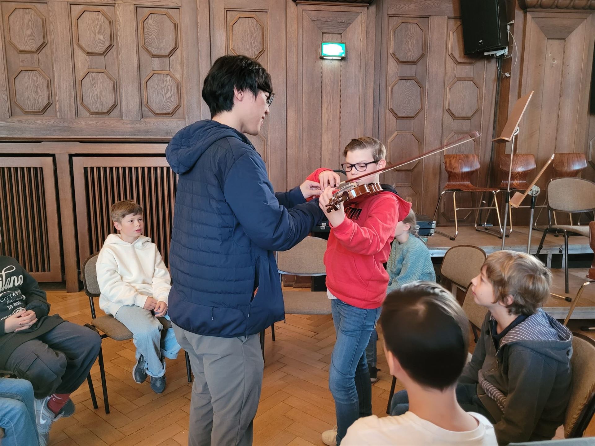 Für Montag, den 23.10.2023, hatte Orchesterleiter Dr. Marcus Schönwitz gemeinsam mit der Leitung der Musikschule Tonart, Sven und Bettina Janning, etwas Besonderes vorbereitet: Unter Leitung und Anleitung erfahrener Instrumentallehrer konnten sich unsere Fünftklässler in der Goetheaula an verschiedenen Instrumenten wie z. B. Geige, Klarinette, Saxophon und Posaune, ausprobieren. Hierbei haben sie unmittelbare und spannende Erfahrungen an den von den Dozenten mitgebrachten Instrumenten gemacht und dabei vielleicht sogar auch ihr Wunschinstrument für sich oder sogar auch das ein oder andere Talent entdecken können. In jedem Fall haben sich alle Kinder über diese spannenden musikalischen Erlebnisse gefreut!