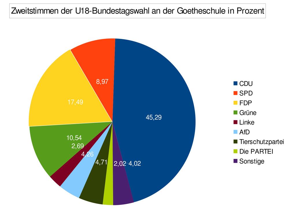 Aus der U18-Wahl an der Goetheschule ging die CDU wie schon bei der U18-Landtagswahl als klare Siegerin hervor. Sie holte das Direktmandat mit 267 Stimmen und erhielt 45,3 % der Zweitstimmen. Mit weitem Abstand folgten die FDP mit 17,5% und B'90/die Grünen mit 10,5%. Danach erst kam die SPD mit knapp 9% der Stimmen. Alle weiteren Parteien wären an der Fünf-Prozent-Hürde gescheitert, wobei die Tierschutzpartei mit 4,7% den Einzug nur knapp verfehlt hätte. Zu erwähnen wären noch die Ergebnisse der Linken (2,6%), der AfD (4,3%) und nicht zuletzt der Satirepartei Die PARTEI (2%). Wir danken noch einmal allen Schülerinnen und Schülern für die rege Teilnahme.