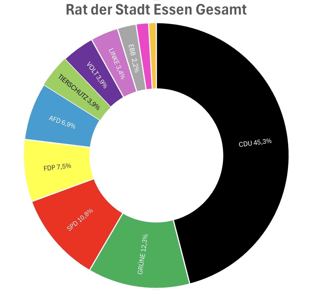 Auch hier erhielt die CDU mit 45,3% die meisten Stimmen, und Grünen und SPD folgen mit großem Abstand, d.h. 12,3% und 10,8%. Alle anderen Parteien sind noch weiter abgeschlagen. Auf dem vierten Platz liegt die FDP mit 7,5%. Es folgen die AfD mit 6,9%, die FDP mit 4,9%, VOLT und Tierschutzpartei gleichauf mit 3,9%, die Linke mit 3,4%, EBB mit 2,2% und die PARTEI mit 1,5%. Bei der Kommunalwahl in NRW gibt es seit einigen Jahren keine Fünf-Prozent-Hürde mehr, so dass viele kleine Parteien in den Stadtrat einziehen.