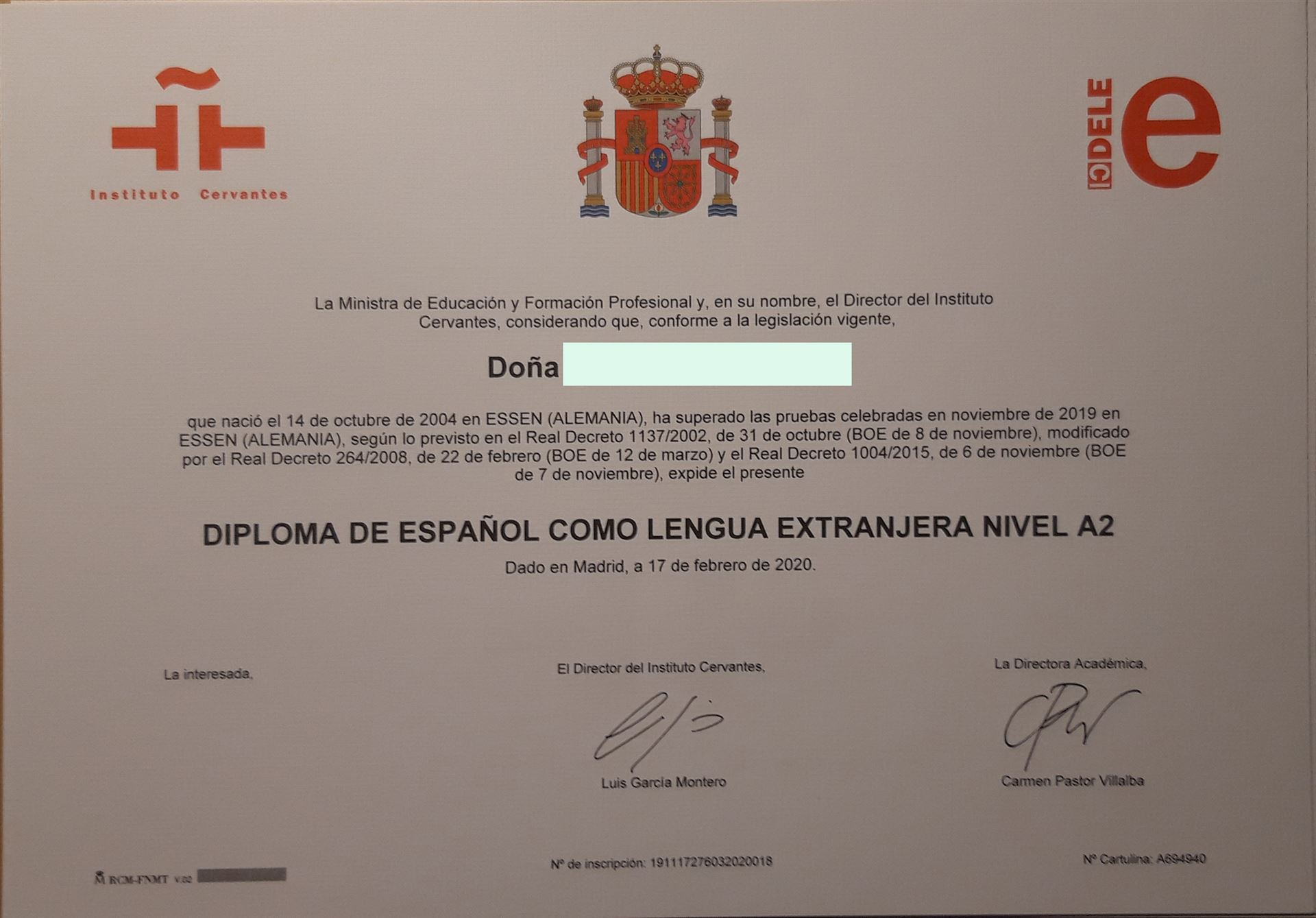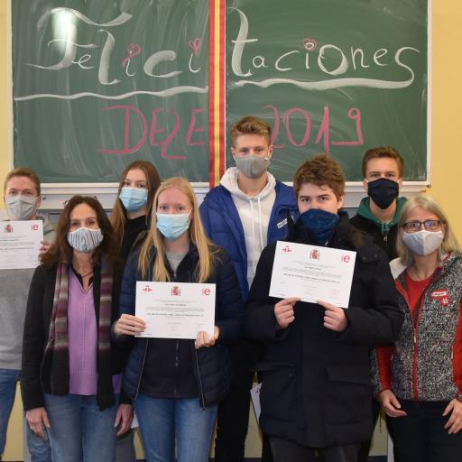 De todo corazón les felicitamos a Moritz Frankhof, Simon Lange, Julius Ruge, Felicia y Linda Schamuhn por haber aprobado los exámenes para conseguir el Diploma de espanol como lengua extranjera, un examen certificado por la Ministra de Eduación y Formación Profesional y, en su nombre, el Director del Instituto Cervantes en Madrid. Han alcanzado los niveles A2 y B1 según el Marco Común Europeo de Referencia para las lenguas en febrero de 2020 (fecha del certificado). Por problemas relacionados con la pandemia del Covid 19 se lo hemos podido entregar - por fin! - en el día de hoy (el 26 de noviembre de 2020).