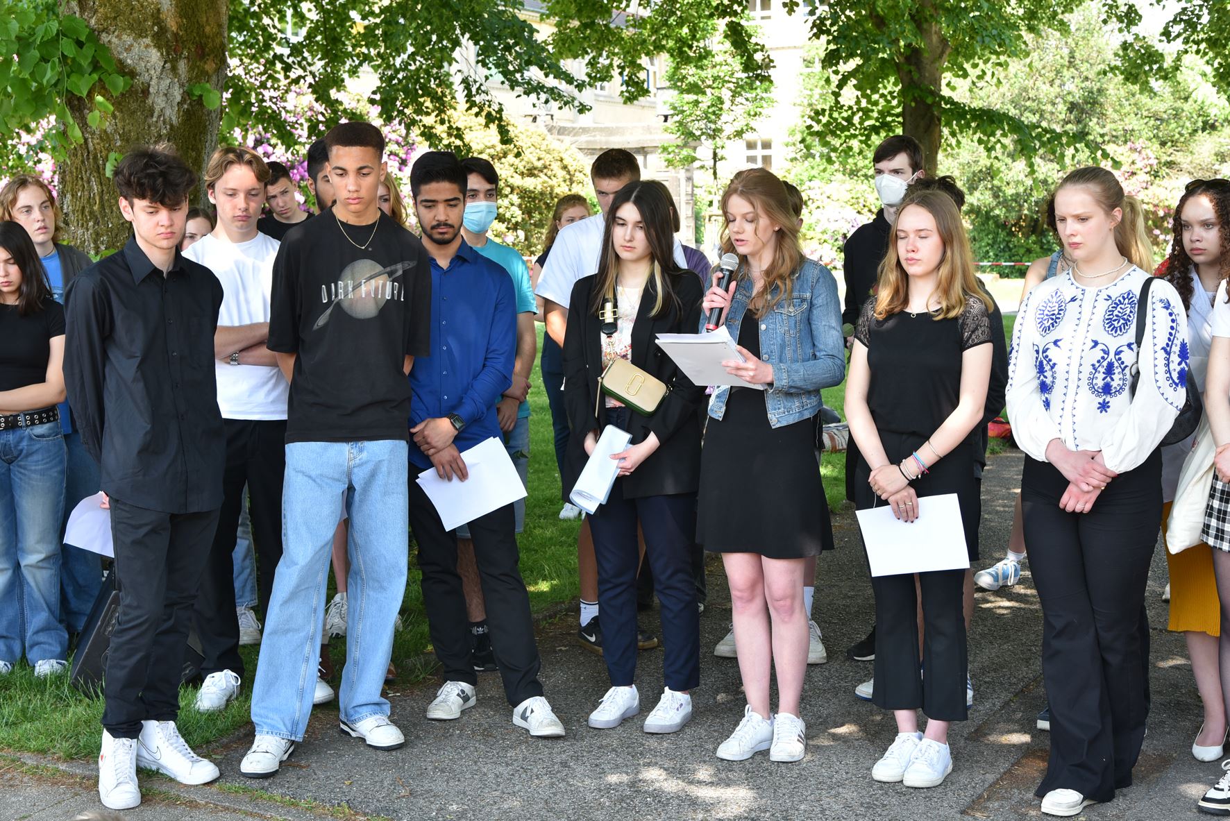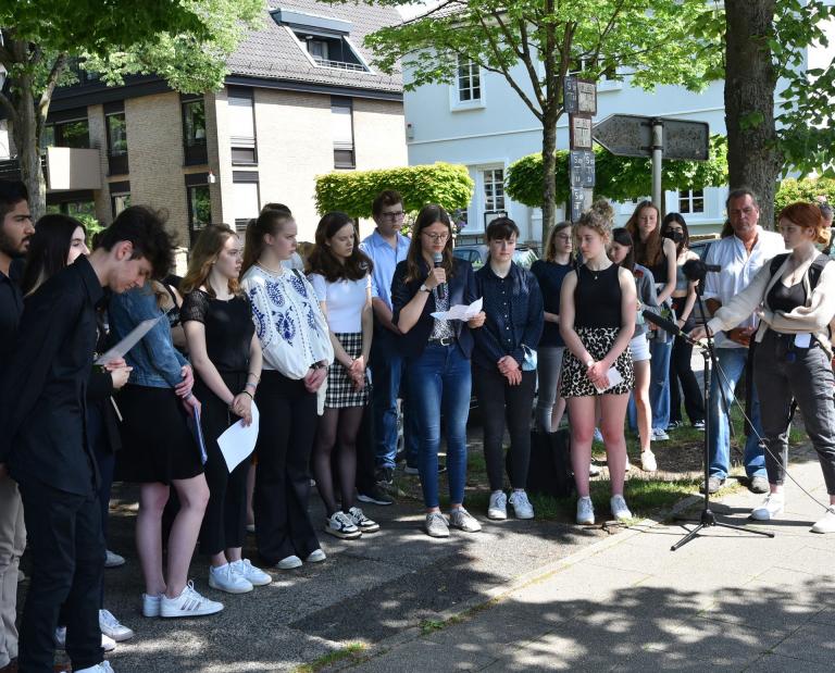 Da dies nicht der Fall war, kamen Herr Herdemerten, der Lehrer des Zusatzkurses Geschichte in der Q2, und der Historische Verein Essen auf die Idee einen Stolperstein für Herbert Weis vor unserer Schule verlegen zu lassen, da er das Bredeneyer Realgymnasium, so der Name unserer heutigen Goetheschule, besuchte. Schnell wurde der Plan gefasst, auch für die sieben weiteren ehemaligen Schüler der Goetheschule bzw. des Bredeneyer Realgymnasiums, die von dem nationalsozialistischen Terrorregime deportiert und ermordet worden waren, ein Denkmal zu setzen, da wir feststellten, dass die bereits vorhandene Gedenktafel neben dem Kunstraum 34 im zweiten Stock wegen der abgelegenen Lage eher wenig Beachtung findet.