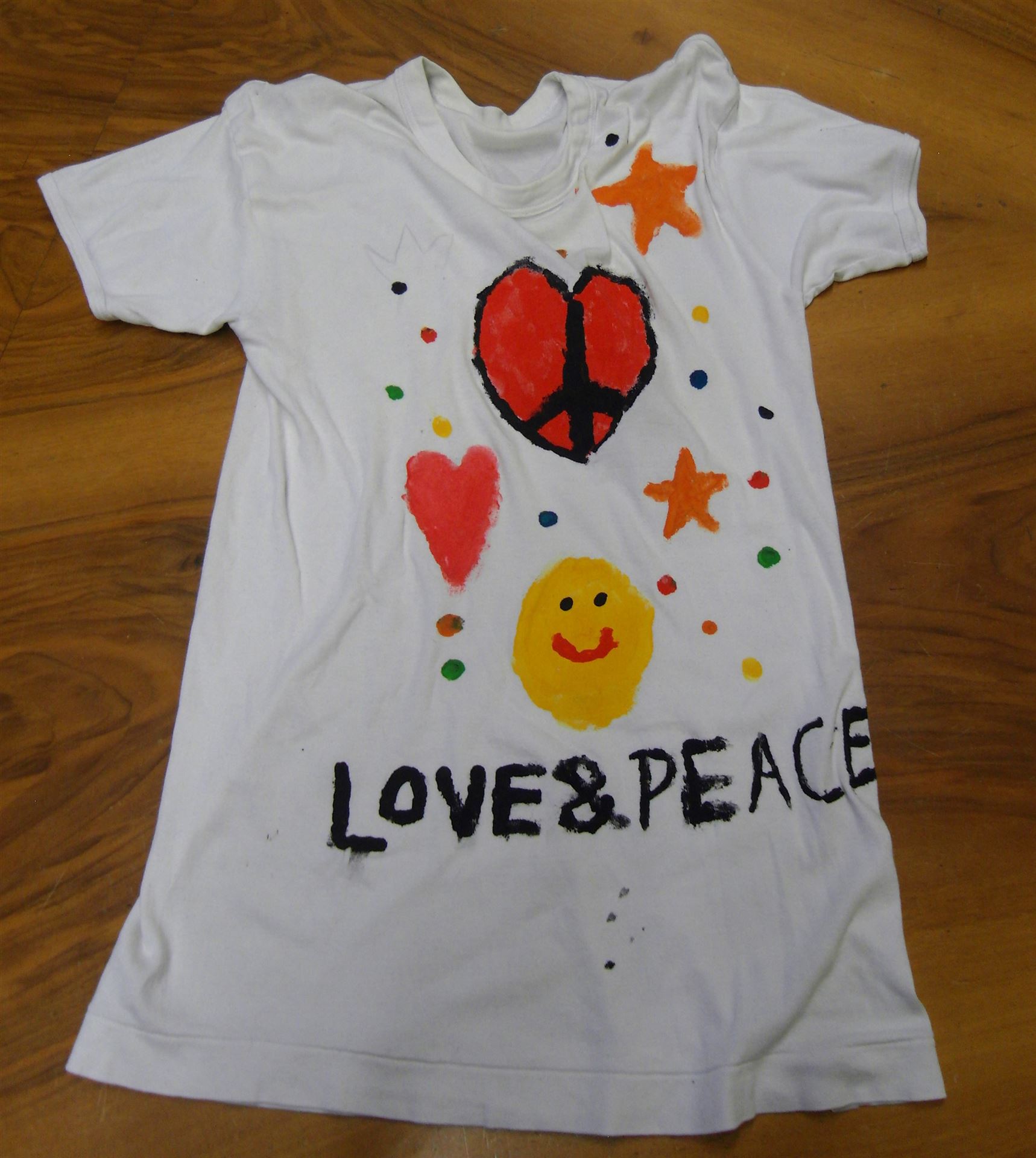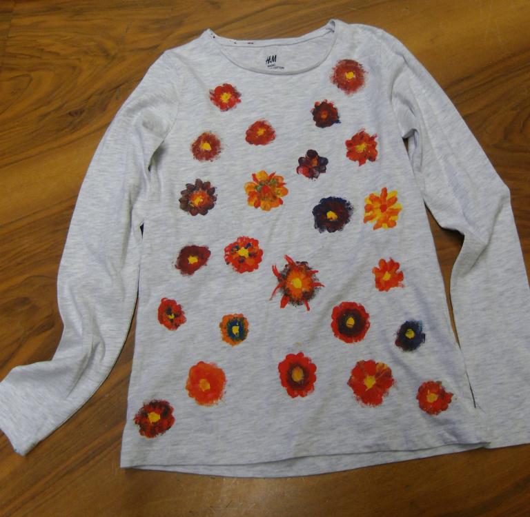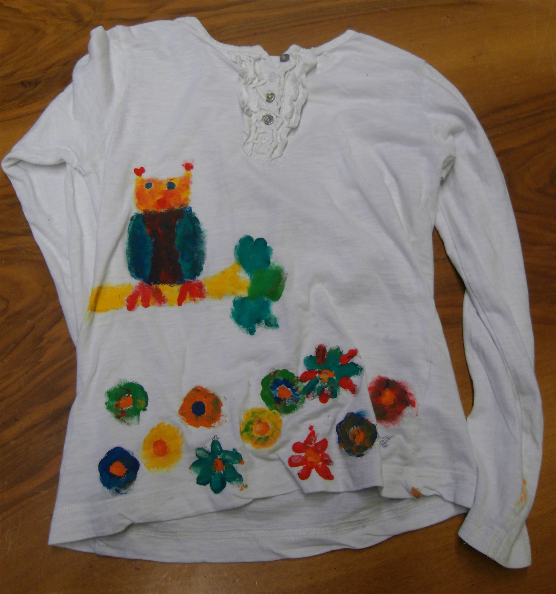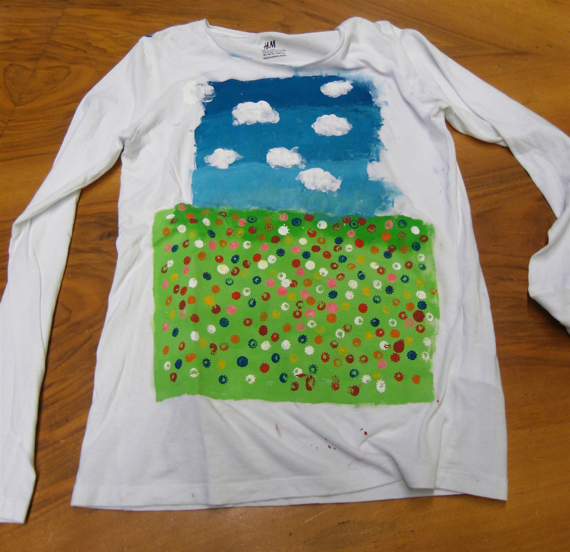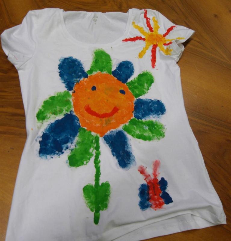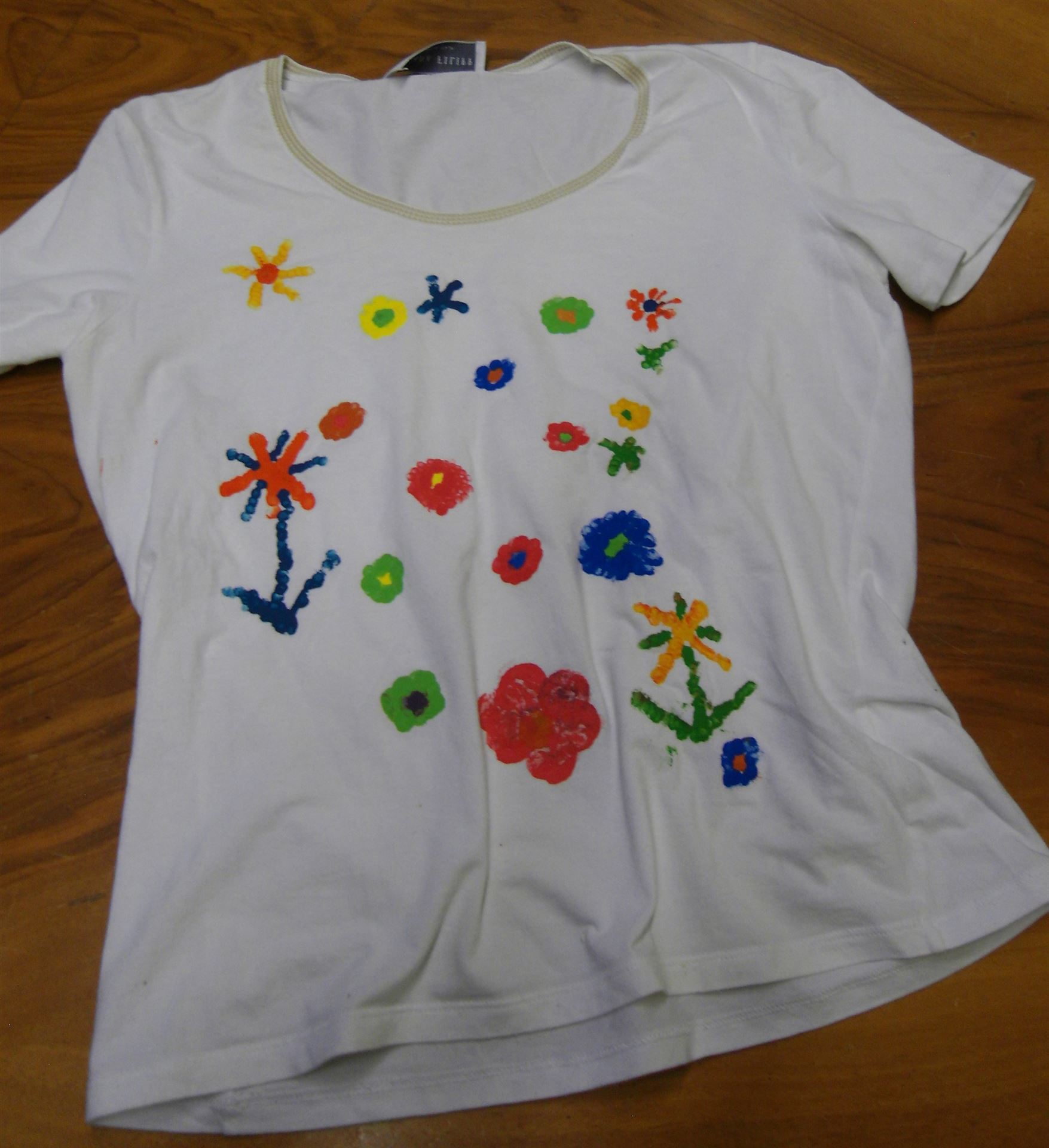 Material: weißes T-Shirt, Stoffmalfarben, Pinsel, kleine Fundstücke als Druckstock, Einlegpappen, damit die Farben nicht auf die Rückseite gelangen