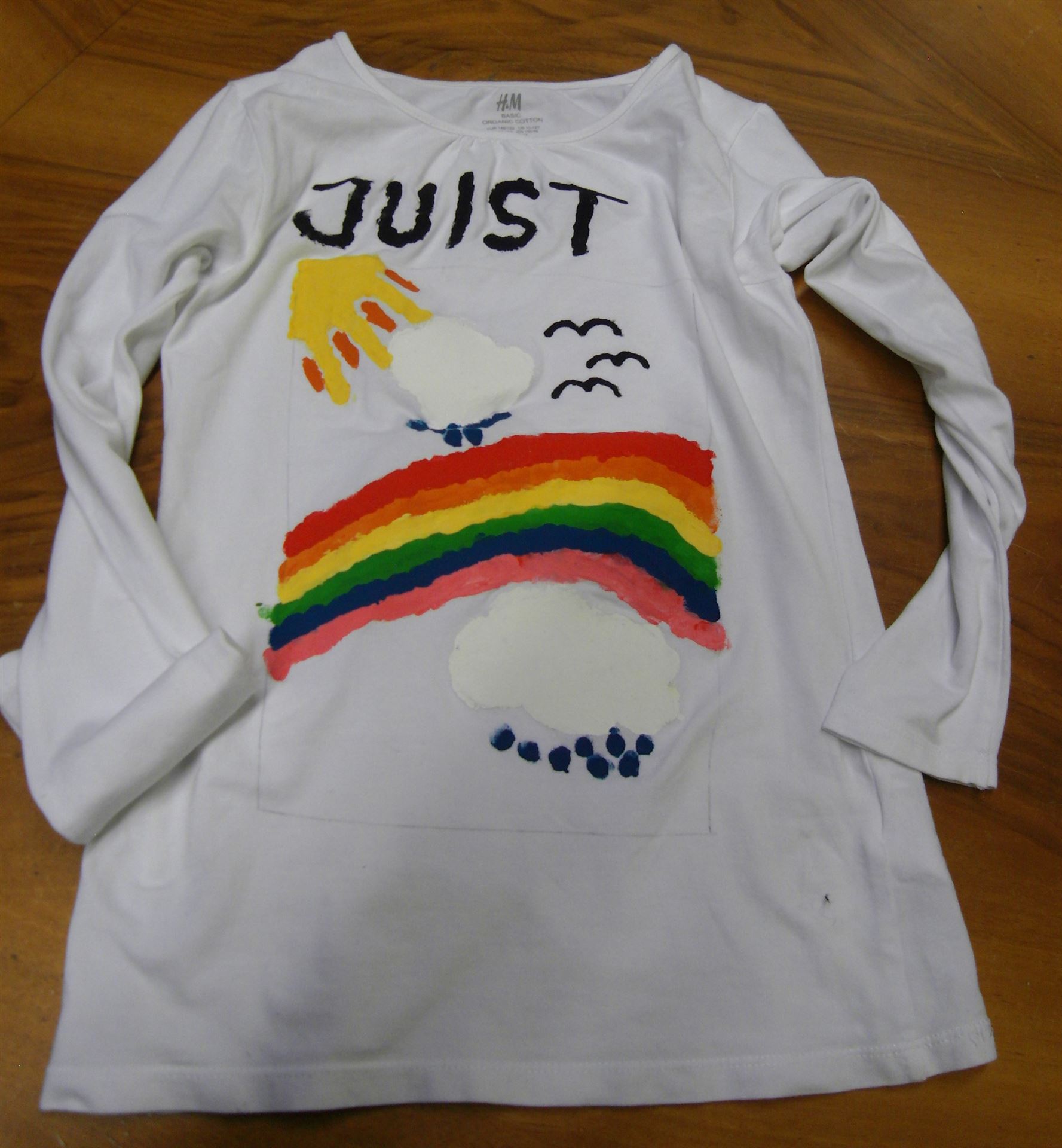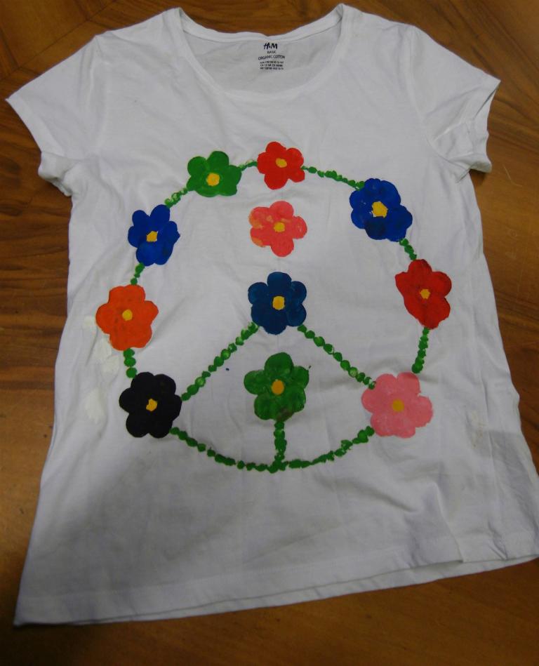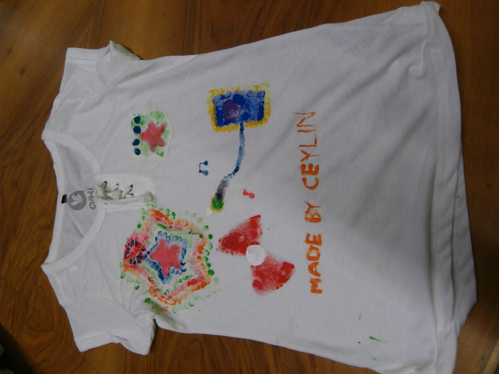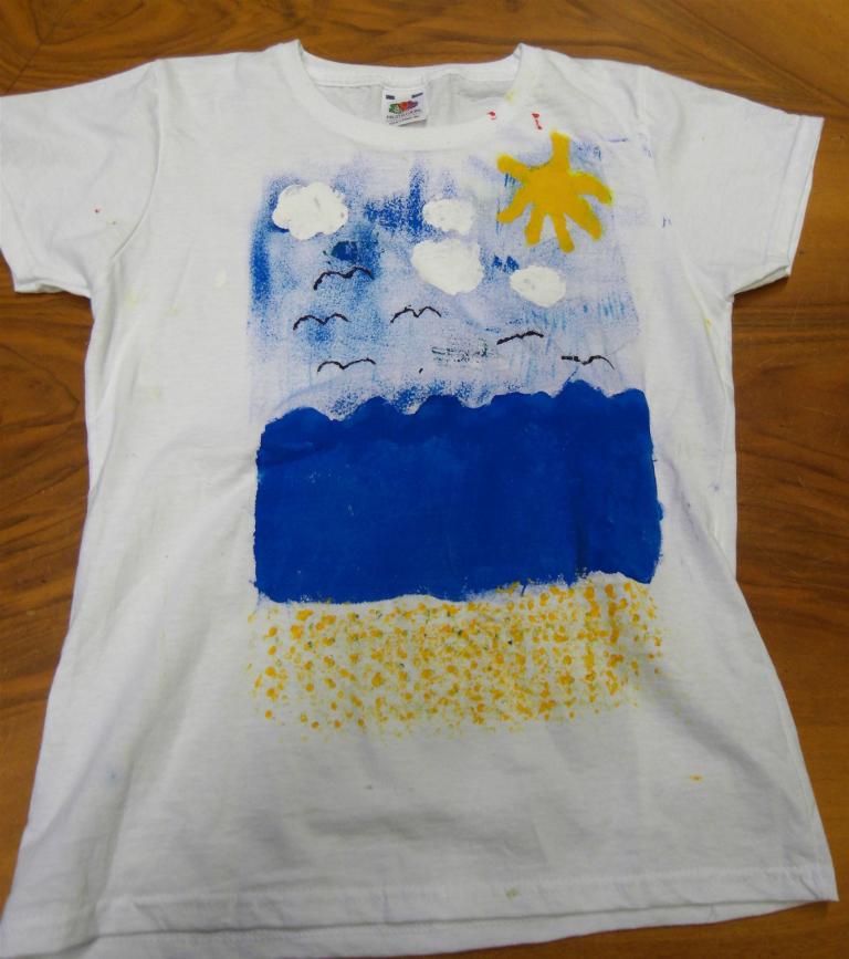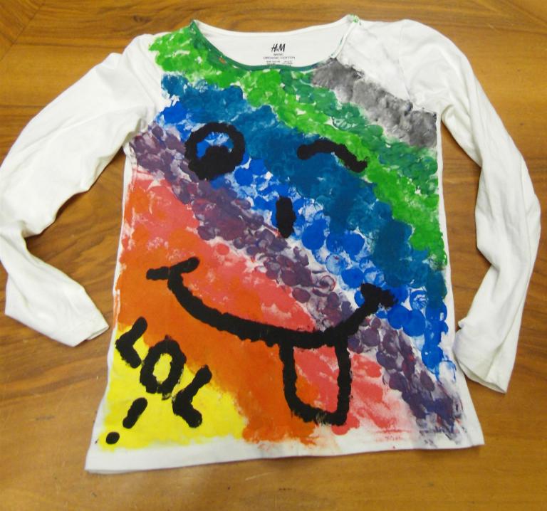 Nach einem ersten Entwurf auf Papier müssen Gestaltungsmöglichkeiten her, die schnell gehen, leicht umzusetzen sind und vor allem viel Spaß machen. So kann jeder Schüler seiner Phantasie freien Lauf lassen und ein individuelles Shirt gestalten. Neben freier Malerei mit Stofffarben kamen kleine Fundstücke, Korken, Steine, Muscheln, Schwämmchen, Perlen, Schrauben..., als Druckstock zum Einsatz.