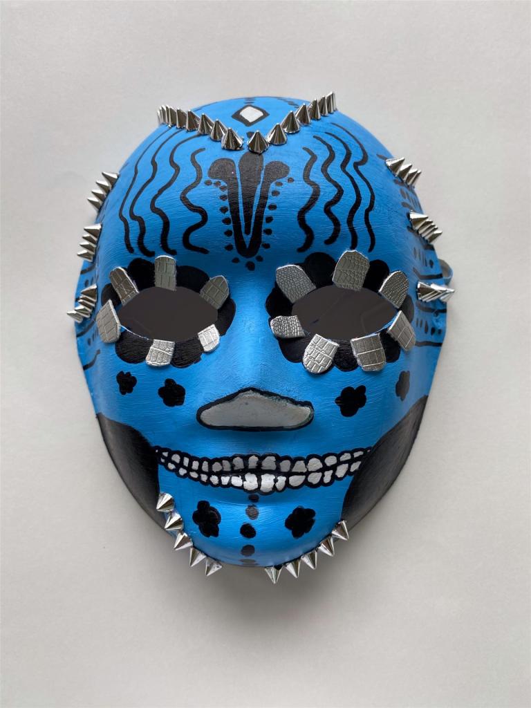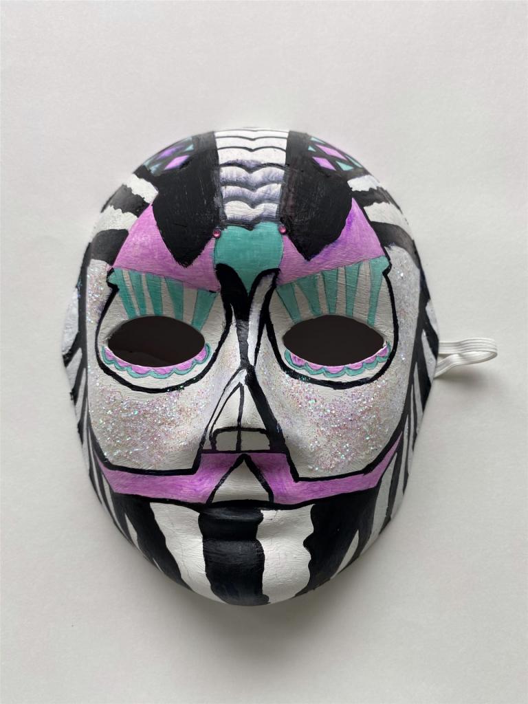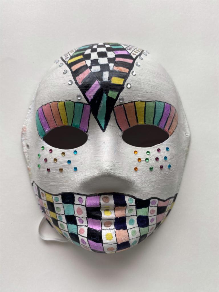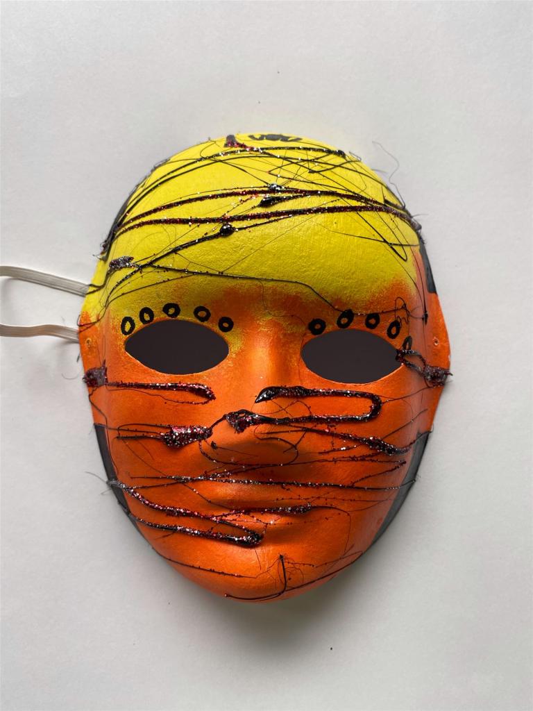 Material: Pappmaché Maske, Acrylfarbe, Heizkleber, Glitzer, UHU, Nieten, Ziersteine, Nadel und Faden, Fineliner, Edding