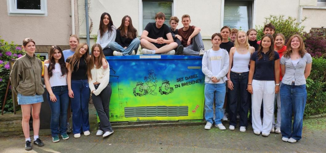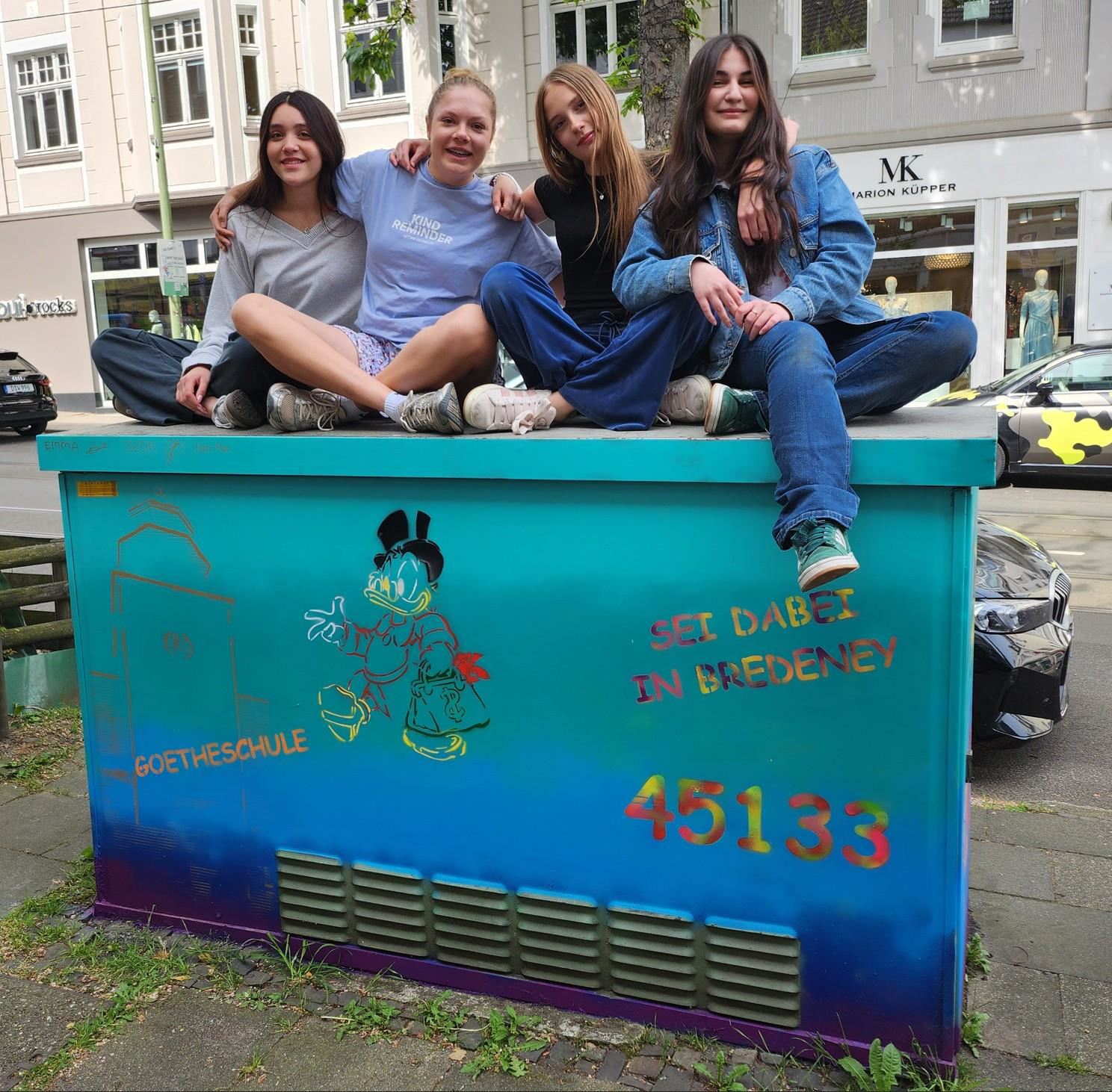 Einer der Kunstkurse der EF hatte Anfang Mai die Gelegenheit, Strom- und Trafokästen an unterschiedlichen Stationen in Bredeney zu gestalten. Angestoßen durch die Bredeneyer Werbegemeinschaft I love BRDNY, vertreten durch Frau Jürgensen und Frau Clauß, und in Zusammenarbeit mit dem Essener Künstler Sharyar Azhdari, der auch das Material zum Projekt spendete, entstanden farbenfrohe Graffitis auf den vormals eher unansehnlichen Verkleidungen der Strom- und Trafokästen vor der Goetheschule und entlang der Bredeneyer Straße.