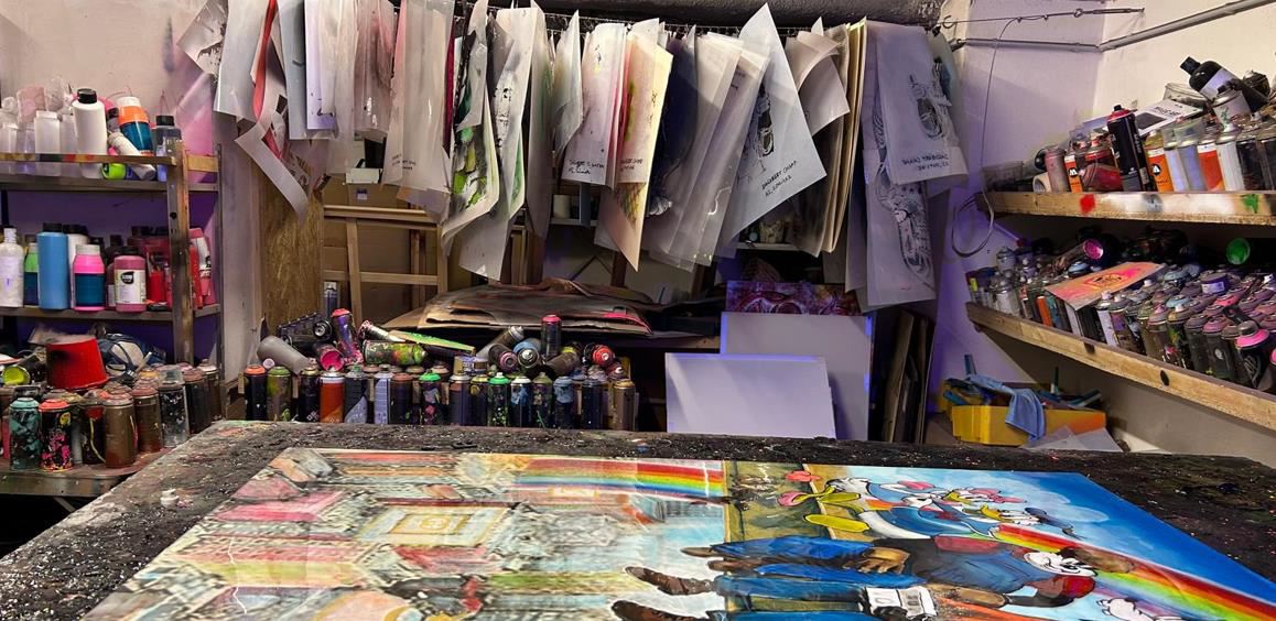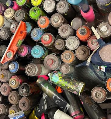 Am zweiten Tag des Projektes hatten die Schülerinnen und Schüler die Möglichkeit, im Atelier den Werkraum zu besuchen und gewannen einen Einblick in die Arbeitsweise des Künstlers. Shary erklärte den Gebrauch unterschiedlicher Farbspraydosen, mit mehr oder weniger Druck befüllt, sodass sich das Sprayverhalten verändert, und verschiedener dazugehöriger Caps. Die Caps, vielfach variierende Sprühköpfe für die Farbdosen, erlauben je nach Ausführung einen flächigen, breiten oder bis hin zu einem linear schmalen Farbauftrag für zum Beispiel Konturen. Es kann je nach Cap lediglich ein feiner Farbnebel verteilt oder gezielt großflächig gearbeitet werden. Sogar Caps, die in Form von Doppelherzchen sprühen, waren dabei. Unter fachkundiger Anleitung durfte jeder das Sprayen ausprobieren und die Arbeit mit einer Schablone üben. Schnell waren zum Abschluss des zweiten Tages Ideen gesammelt, was die einzelnen Stromkästen verzieren sollte und mit welchen Farben die Teams arbeiten wollten.