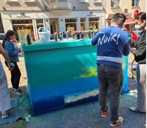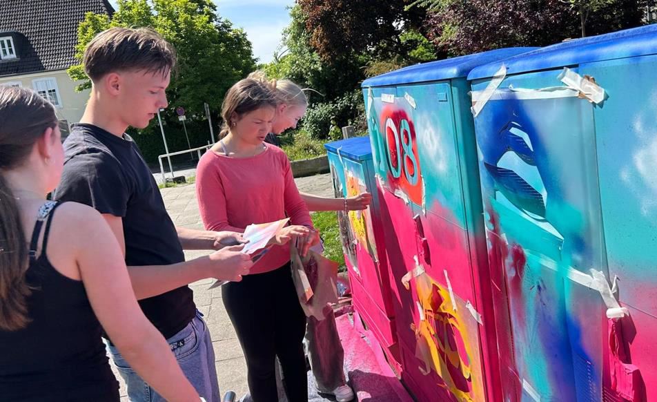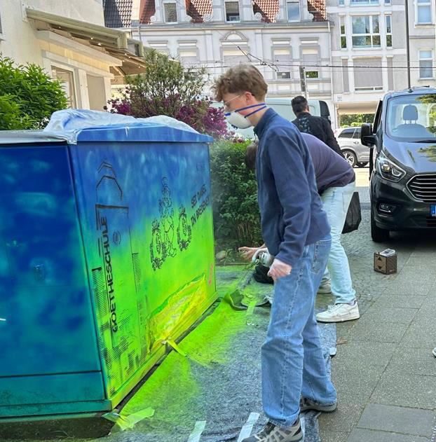 Der dritte Projekttag startete dann direkt an der Goetheschule. Nach kurzer Lagebesprechung begaben sich die Teams zu ihren jeweiligen Stationen, ausgestattet mit Klebeband, Handschuhen, Masken, Eimern, Spachteln, Lappen und Bürsten, denn zunächst mussten die Strom- oder Trafokästen von grobem Schmutz und Aufklebern gereinigt werden. Eine Schülergruppe erntete schon bei diesen vorbereitenden Arbeiten großes Lob einer Anwohnerin, das sie den „jungen Herren“ dafür zollte, dass sie „das schmutzige Ding“ putzen.