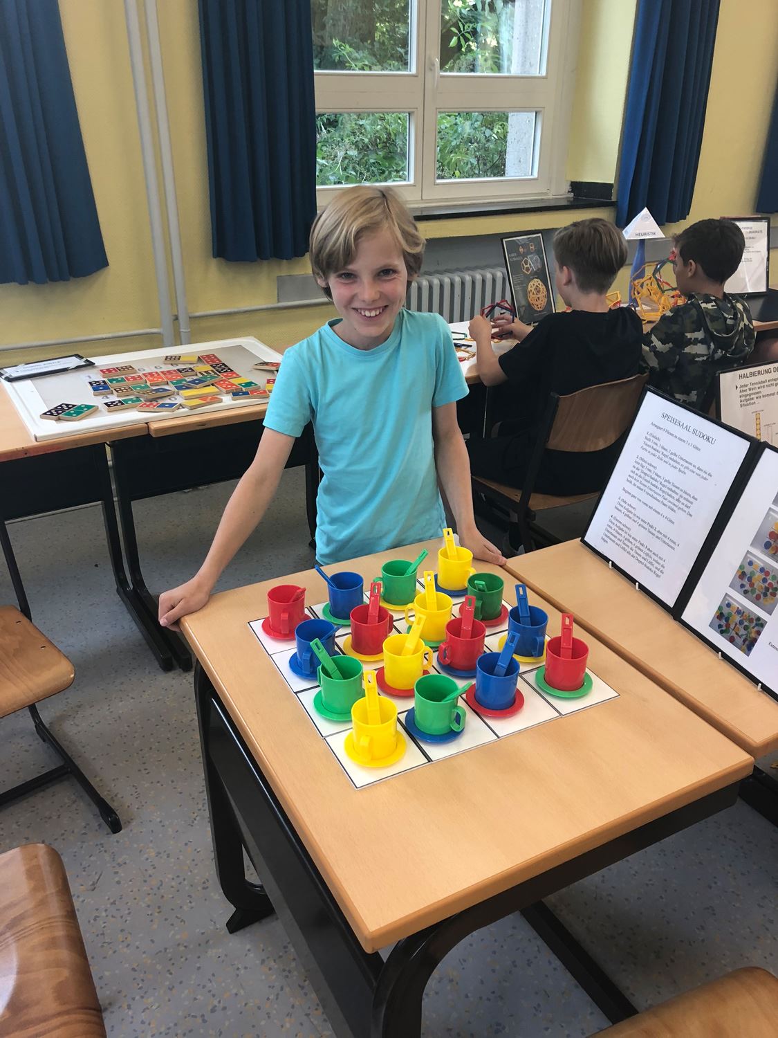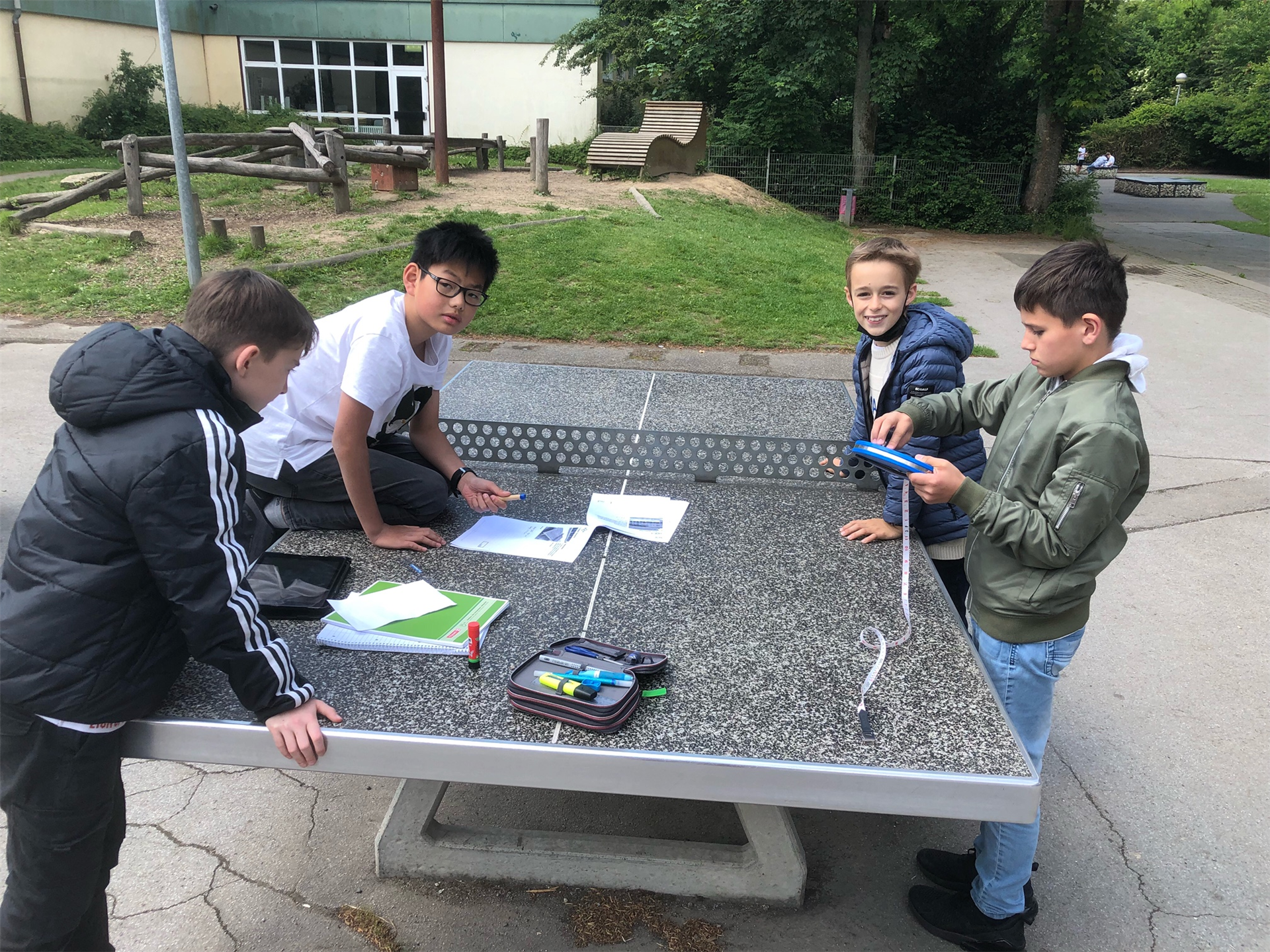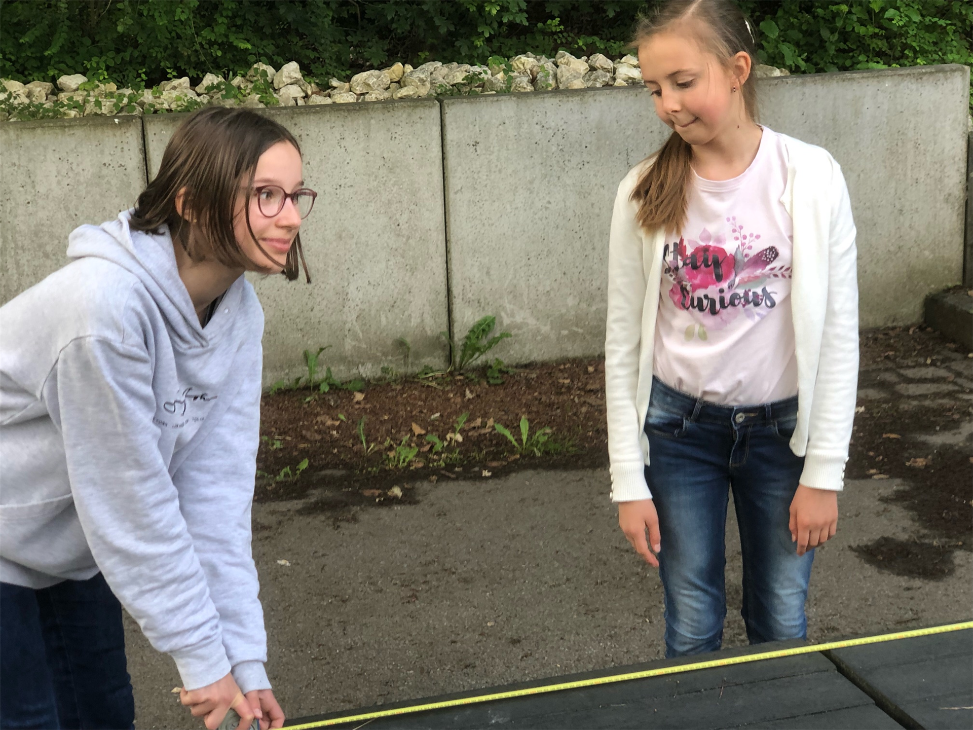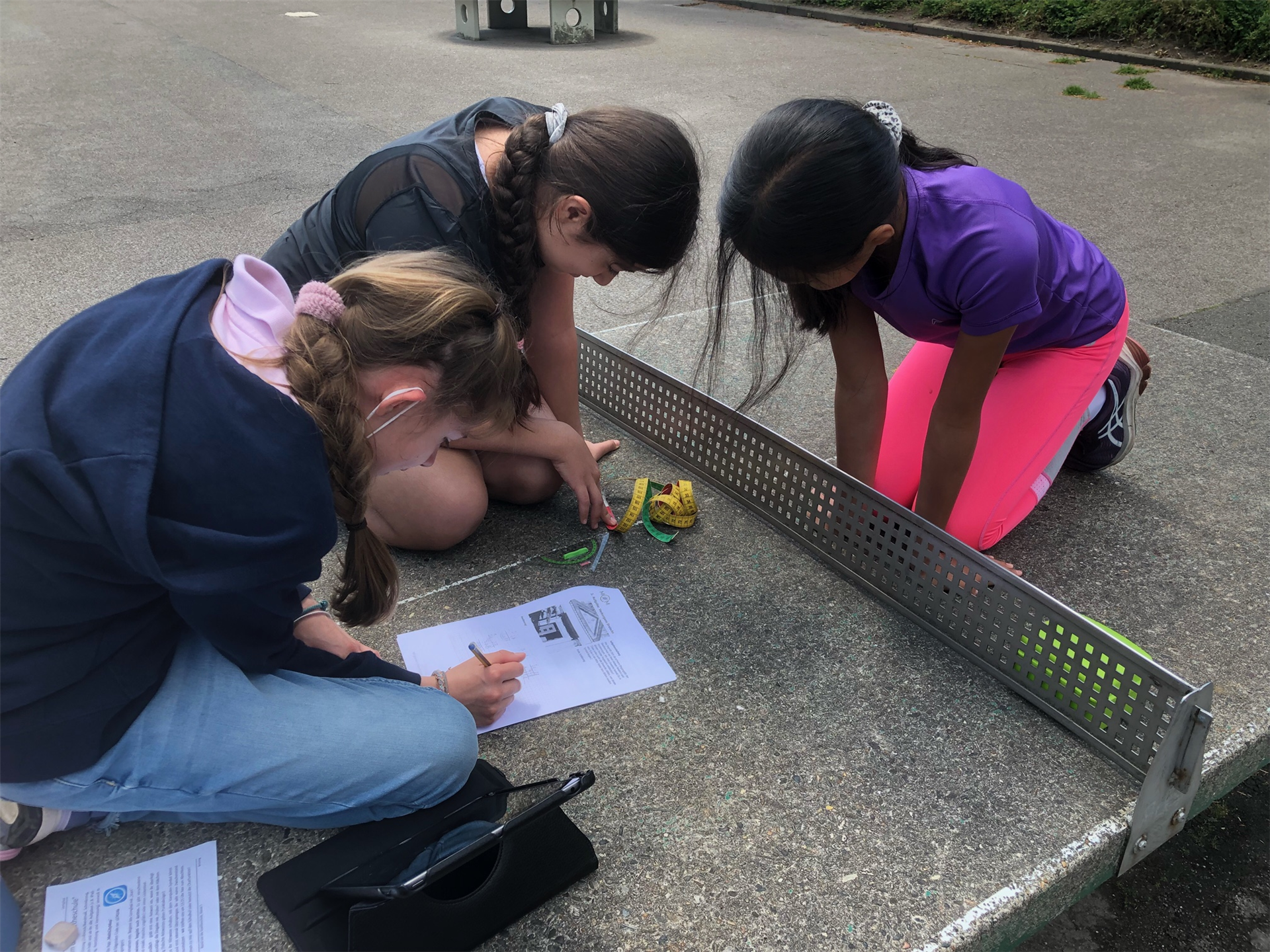 „Jaaaaaa!“ – Alle paar Minuten schallt ein lauter Jubelschrei aus einer anderen Ecke des Schulhofs, wieder hat eine Gruppe ein richtiges Ergebnis zu einer der sieben Aufgaben eingegeben. Am Donnerstag, 2. Juni, läuft die 5a in Kleingruppen über den Schulhof der Goetheschule zu verschiedenen Stationen, um sich dort mit ihrem bis zum Ende des 5. Schuljahres angehäuften Wissen in der Praxis zu beweisen. Die meisten sind in ihren Teams bestückt mit Maßbändern, Zollstock und einem iPad der Schule und stecken die Köpfe immer wieder zusammen, um die praktischen Aufgaben zu lösen.