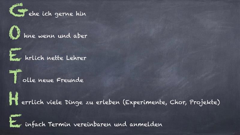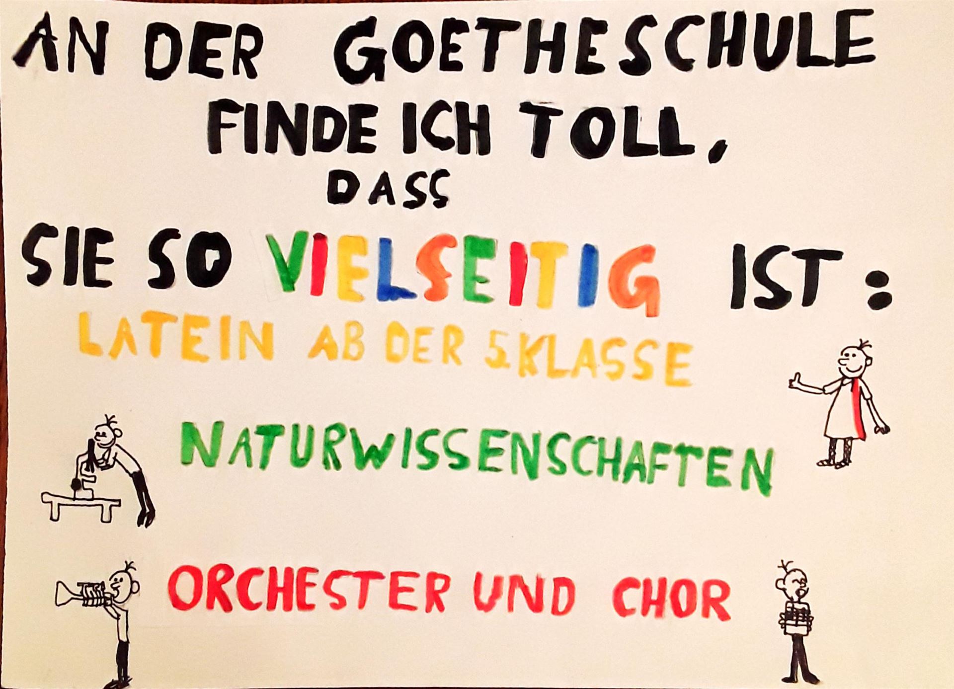 Meine ersten Tage auf der Goethe waren sehr spannend. Bei der Einschulung haben uns die Unterstufenkoordinatorin und die Schuldirektoren willkommen geheißen und natürlich auch unsere Klassenlehrer. Danach haben uns unsere Lehrer in unsere Klassen geführt. Dort habe ich meine Klasse kennen gelernt. Nach 2 Stunden war unser erster Tag auf der Goethe zu Ende und unsere Eltern haben uns abgeholt. Am nächsten Tag begann der richtige Unterricht mit tollen Fächern. Die neuen Fächer machen mir viel Spaß. In der ersten Sportunterrichtstunde haben wir etwas über Teamarbeit mit einem tollen Spiel gelernt. In Biologie haben wir auch schon mit Mikroskopen gearbeitet, das hat mir richtig viel Spaß gemacht. Außerdem gibt es ein tolles Bistro mit leckerem Essen. Ich bin auch noch im Chor, wo wir schon echt schöne Weihnachtslieder singen und am Ende des Jahres vor den Eltern auftreten. Mir gefällt der Chor ziemlich gut. Außerdem gibt es auch viele tolle AGs. Ich bin auch in der Zirkus-Ag, dort macht es mir großen Spaß.
