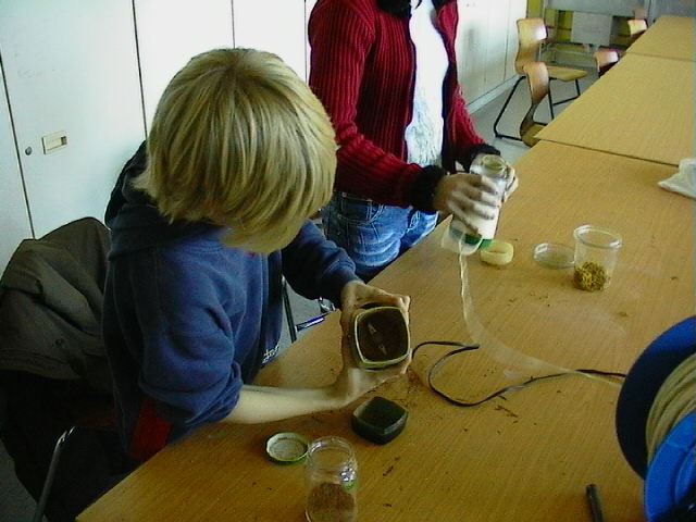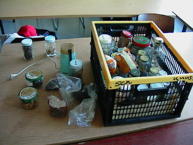 Eine reichhaltige Sammlung von geeigneten Stoffen wurde durch die Mitglieder der Kunst AG erstellt, so Schalen von Nüssen, Holzkohle, verschiedene Steinsorten, Kakao, Kaffeebohnen, Orangenschalen, getrocknete Blüten und Blätter, Gewürze wie Curry, Ingwer, Paprika, Safran, Senfkörner, Zimt, Mohn, die mit Kaffeemühlen und Mörsern gemahlen wurden. Tee wurde gekocht, Fruchtsäfte gepresst, getrocknete Gemüse wie Mais, verschiedenfarbige Linsen und Erbsen gemahlen. Rotkohlsaft, Traubensaft, Holunderbeeren, Möhren, gekochter Saft von roten und brauen Zwiebelschalen ergänzten die Auswahl farbiger Stoffe.