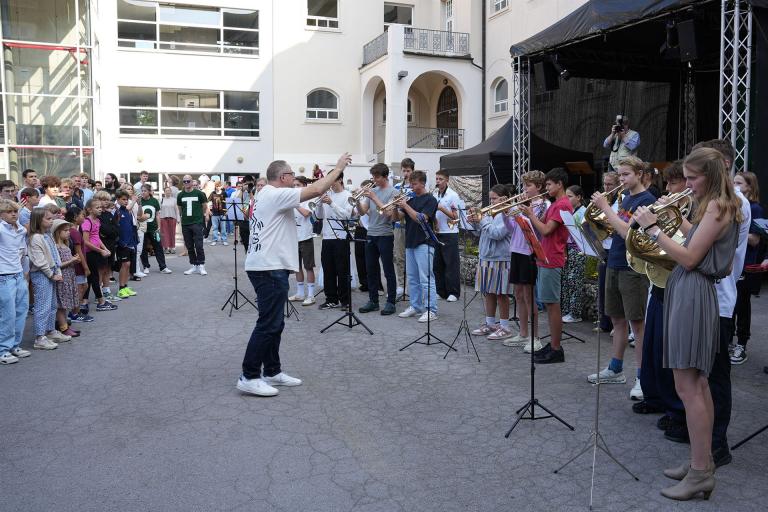 Mit einer festlichen Bläserfanfare wurde die Eröffnung des Schulfests eingeleitet. Diese hatte Dr. Marcus Schönwitz eigens zum Schuljubiläum komponiert.