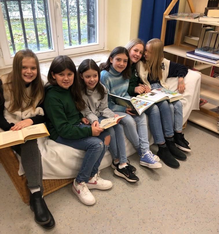 In der schülergerecht eingerichteten Schülerbücherei übernehmen Schülerinnen und Schüler als ausgebildete Bibliothekshelfer die Betreuung. Zahlreiche Sitz- und Liegeangebote bieten die Möglichkeit, sich aus der Auswahl aus vielen Büchern zu bedienen und es sich zum Lesen gemütlich zu machen.