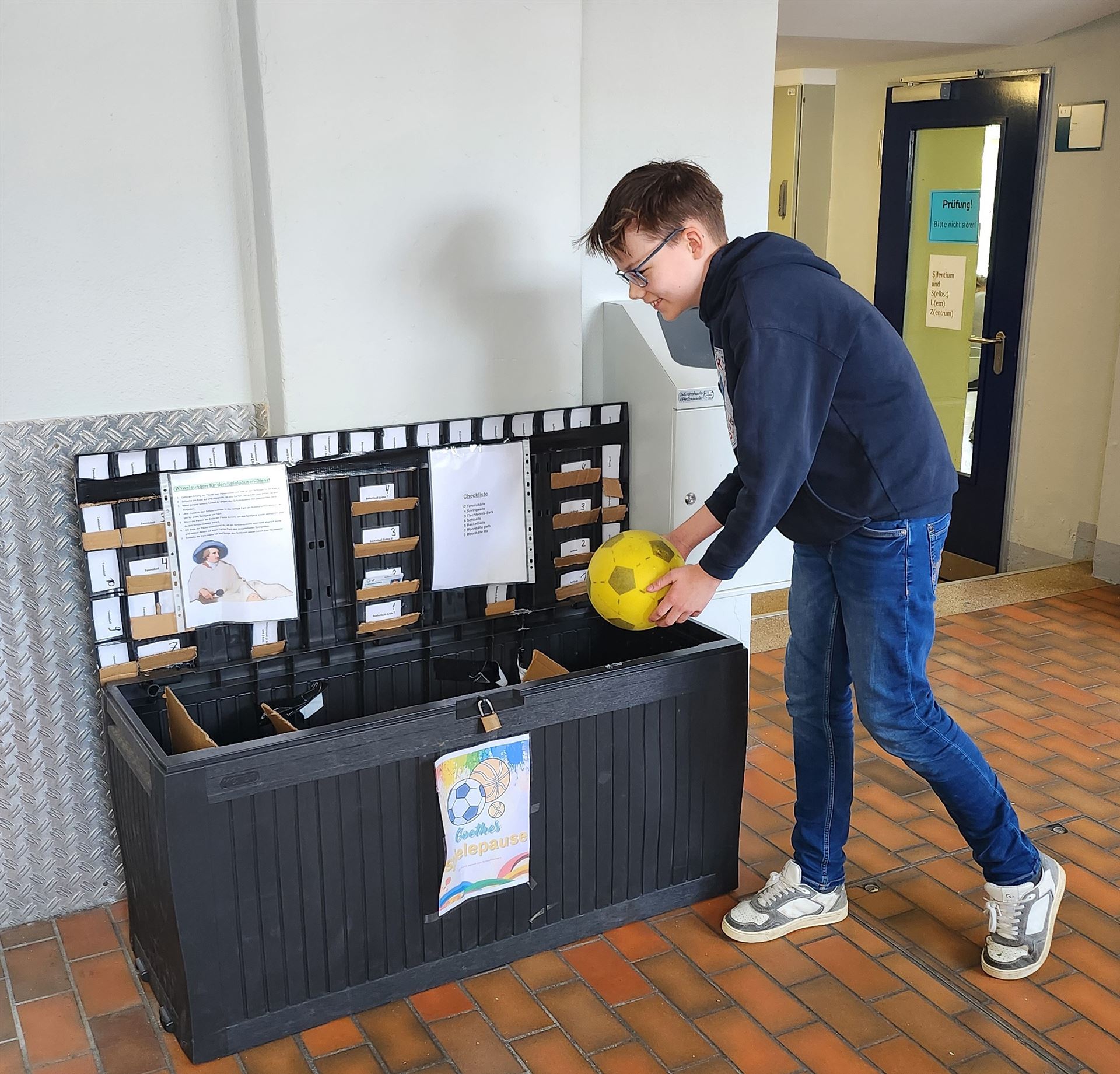 Gegen Abgabe des Schülerausweises können die Gegenstände aus einer großen Kiste ausgewählt und ausgeliehen werden. Schülerinnen und Schüler der 6. Klassen übernehmen im wöchentlichen Wechsel am Anfang der Pausen die Ausleihe und am Ende der Pausen die Entgegennahme und beraten auch gern zur Verwendung der Spielgeräte.